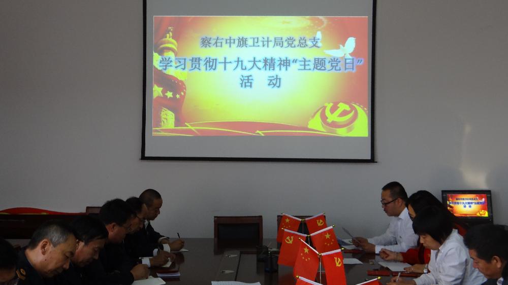 2017年11月6日,察右中旗卫计局全体党员干部齐聚局机关党员活动室,开展学习贯彻十九大精神主题党日活动。此次活动的主要议题是学习贯彻十九大精神,全体党员干部认真学习领会习总书记的十九大报告。